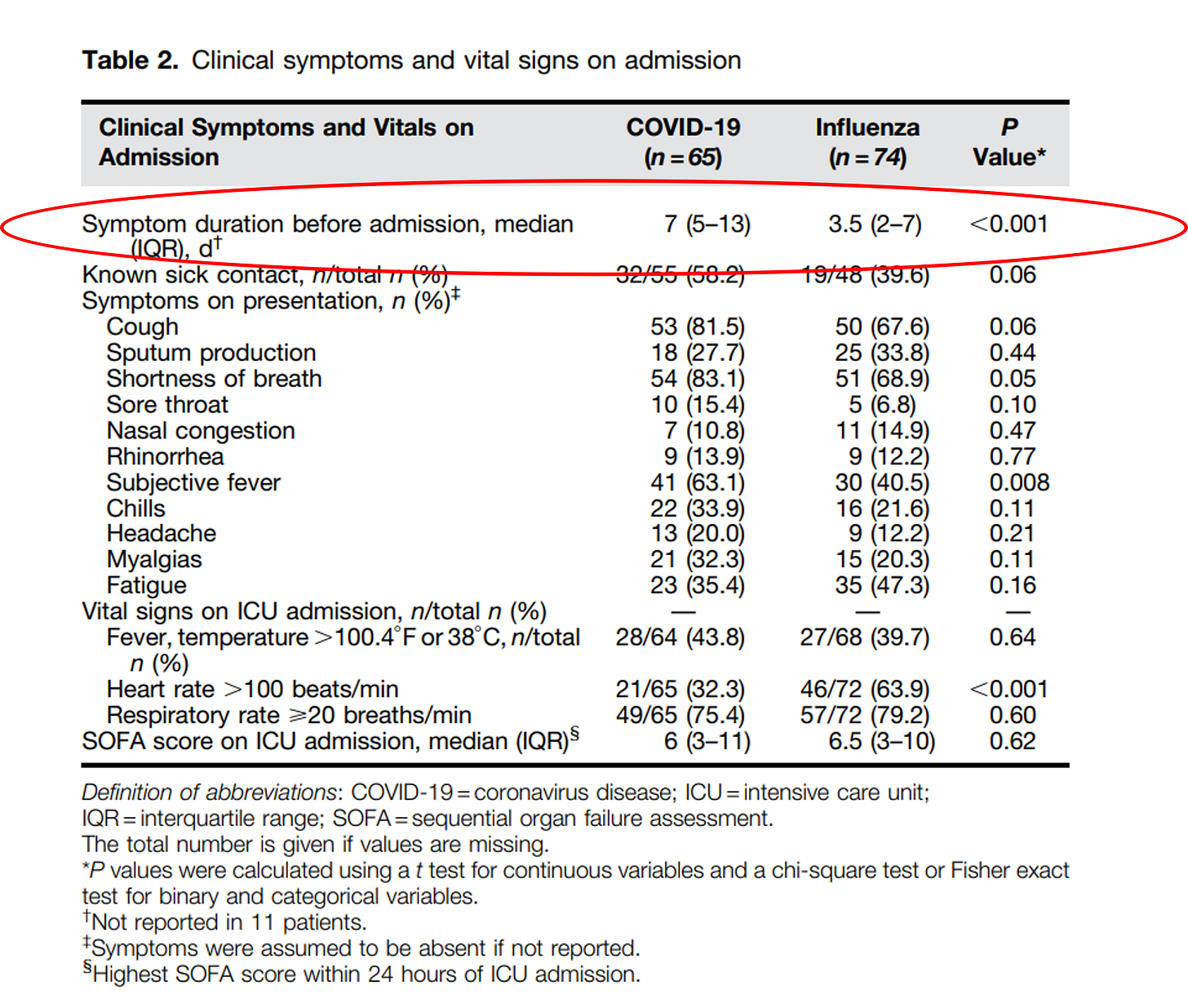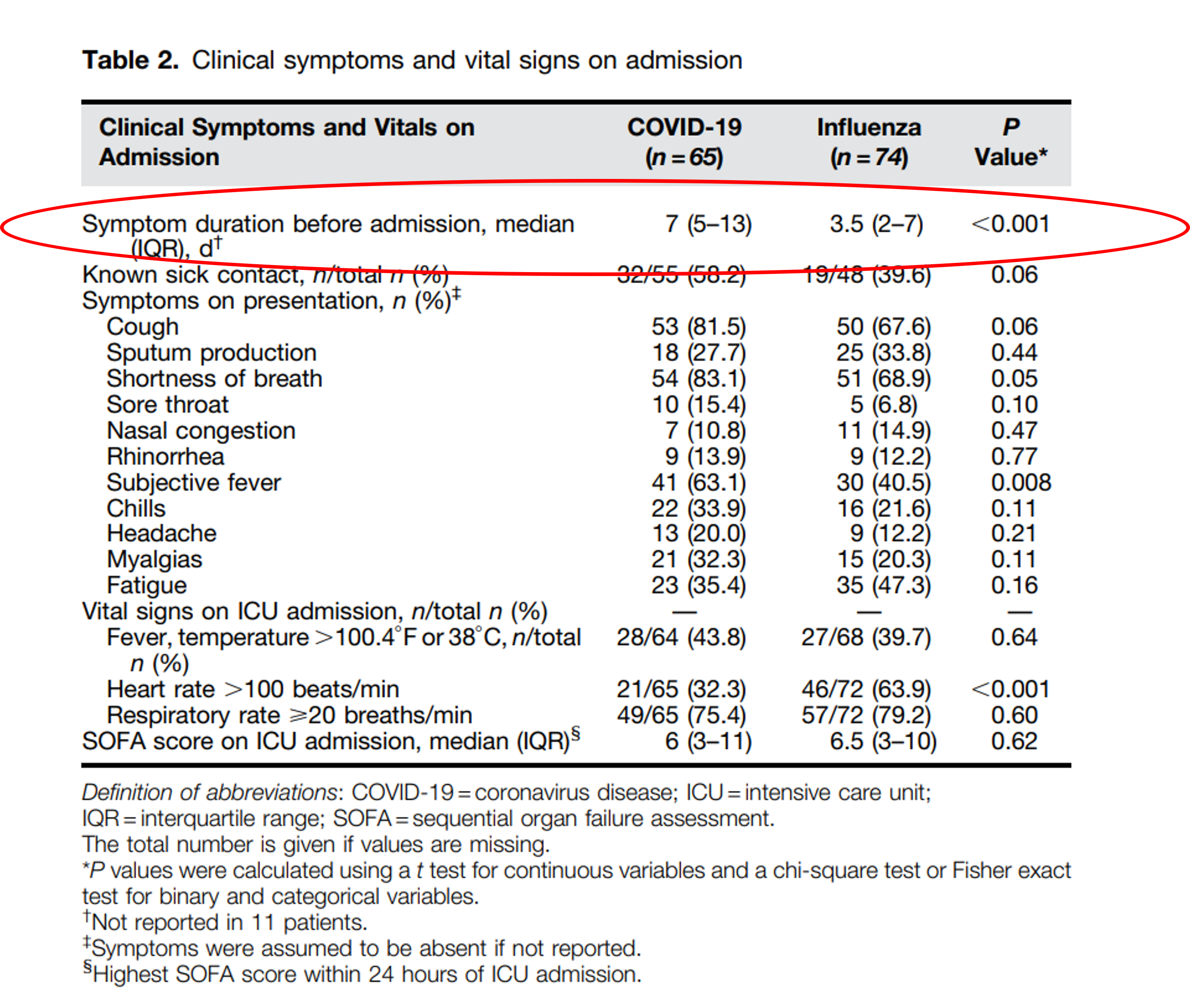 A search of PubMed turned up many broadly relevant and informative scientific articles, but only one article generated by the search was based on 2020 US data and also reported on symptom duration prior to health care facility presentation (hospital admission) for COVID-19 versus non-COVID-19 (influenza) respiratory cases. The article is entitled, “Comparison of Clinical Features and Outcomes in Critically Ill Patients Hospitalized with COVID-19 versus Influenza”. The following table (Table 2) is taken directly from the article,